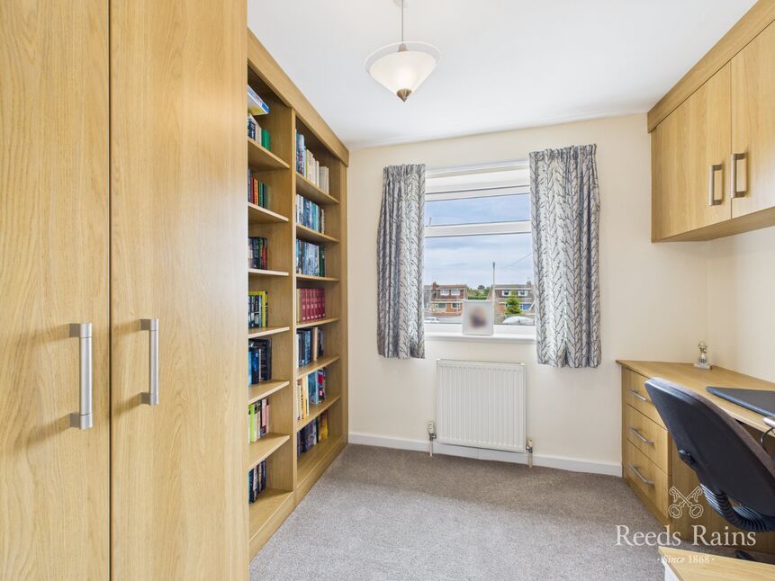 Currently used as a superb home office with an excellent arrangement of fitted furniture including cupboards, desk, drawers and open shelving. Radiator. A front-facing window ensures the room remains light and airy throughout the day.