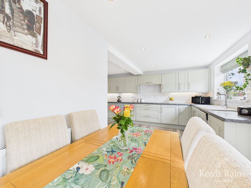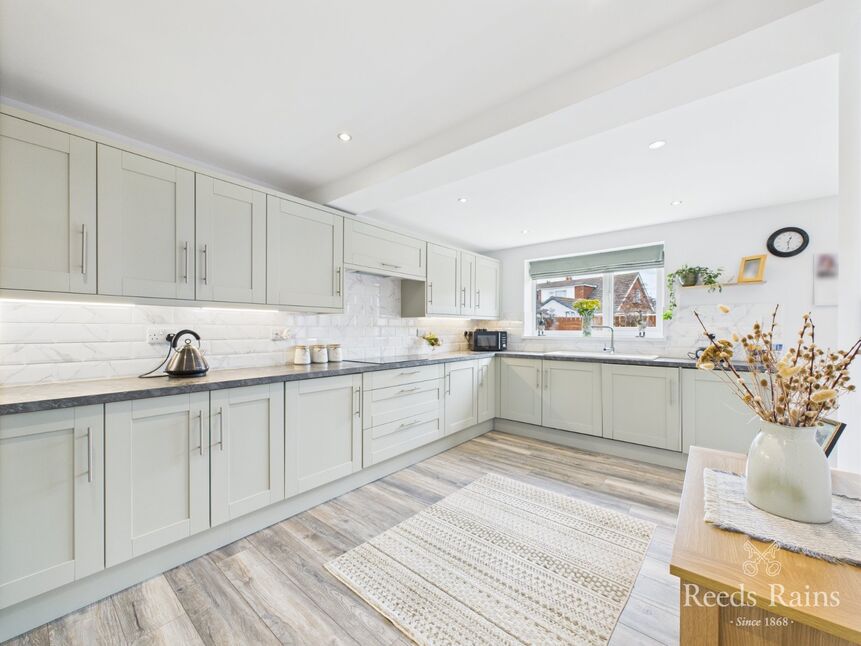 STUNNING KITCHEN-DINING SPACE – THE TRUE HEART OF THE HOME! - Fully transformed and extended, this exceptional kitchen and dining room spans the rear of the property and offers a luxurious setting for daily life and entertaining alike. Fitted with a high-spec range of sage green Shaker-style units, the kitchen boasts soft-close cupboards and drawers, stylish laminate worktops, and ceramic brick-effect tiling to the splashbacks. A composite sink with mixer tap sits below a rear window, and a suite of integrated appliances includes a ceramic hob with extractor, eye-level double oven, fridge-freezer, washing machine, and dishwasher. Under-cabinet lighting and inset ceiling spotlights provide the perfect ambiance, while the dining space easily accommodates a table and freestanding furniture. With direct access to the rear garden, this room offers both practicality and wow-factor in equal measure.