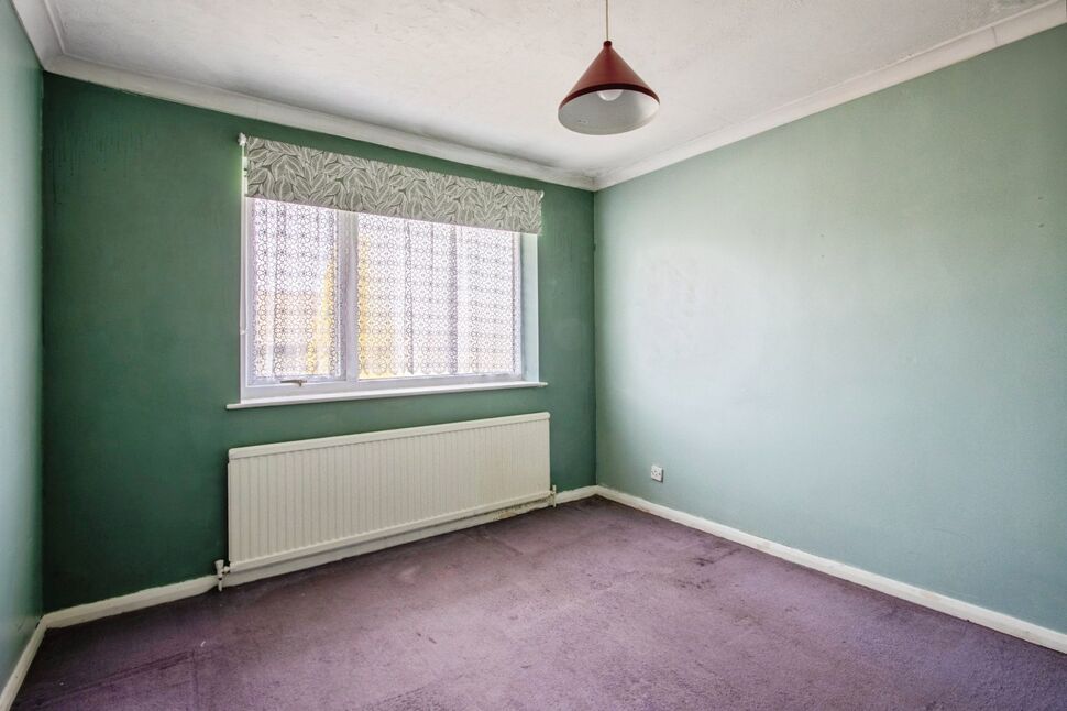 Single bedroom having a central heating radiator, built-in storage cupboard and front facing double glazed window.