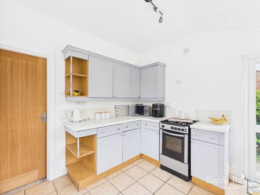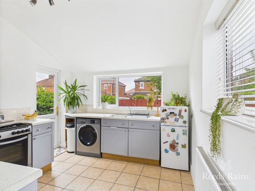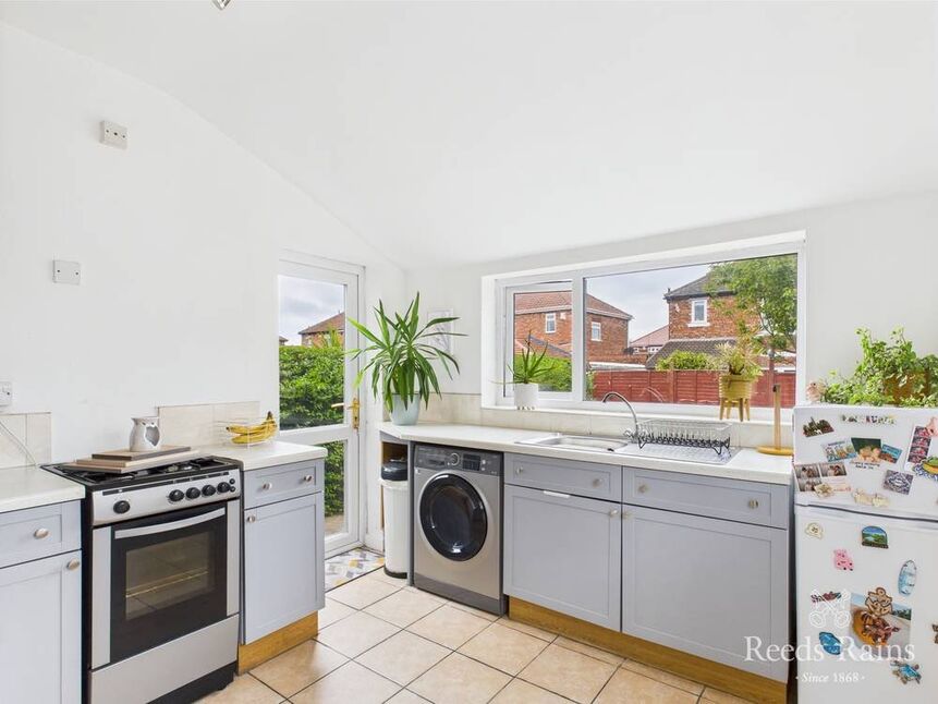 Fitted with a range of base and wall mounted units with the base units having work surfaces above which incorporate a sink with mixer tap over. Cooker space and plumbing for washing machine. Double glazed window Door gives access to the rear garden.