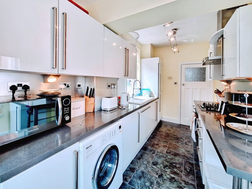 Also looking to the rear elevation of the property, with modern wall and base units, sink with drainer, gas hob electric oven, extractor over, dish washer, space for washing machine and fridge freezer, radiator, uPvc window and external door.