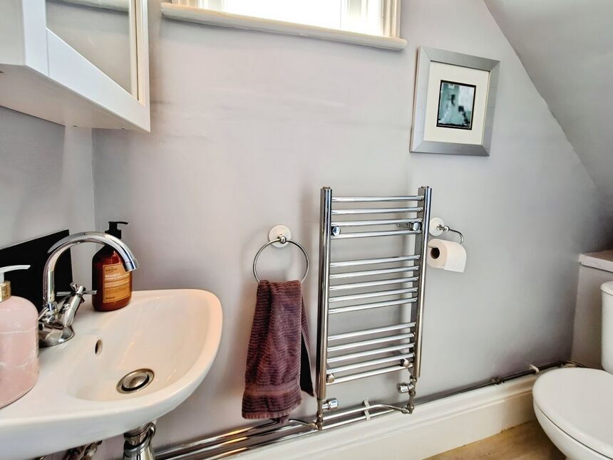 A four piece bathroom suite, with a walk in shower, bath, wc, handbasin, heated towel rail and uPvc windows.