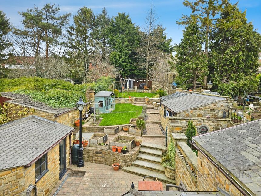 Externally, the home truly comes into its own. To the front, there's a large driveway providing off-street parking for multiple vehicles. To the rear, you'll discover an impressive tiered and landscaped garden – a tranquil retreat with a greenhouse, outbuilding, and electrical points thoughtfully installed throughout, making it the perfect setting for summer BBQs, gardening, or family playtime.