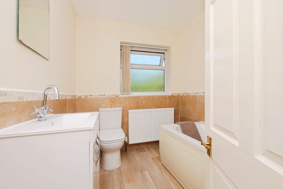 White suite comprising of panelled bath with shower over, low level w.c, vanity wash hand basin, part tiled walls, double glazed window to the rear and radiator.