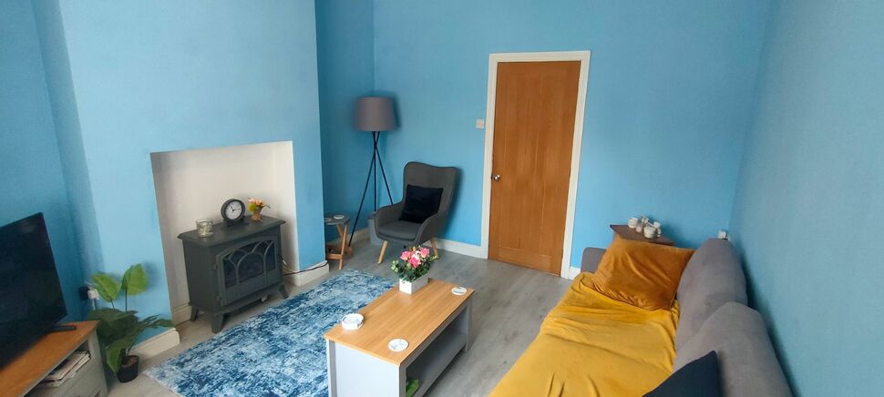 UPVC double glazed window to front with radiator below. Log effect wood burning stove being an electric fire in cast iron frame within the chimney breast recess. Laminate wood floor. Overhead electric fuse box. Coved ceiling. Ceiling light point. Solid oak door to: