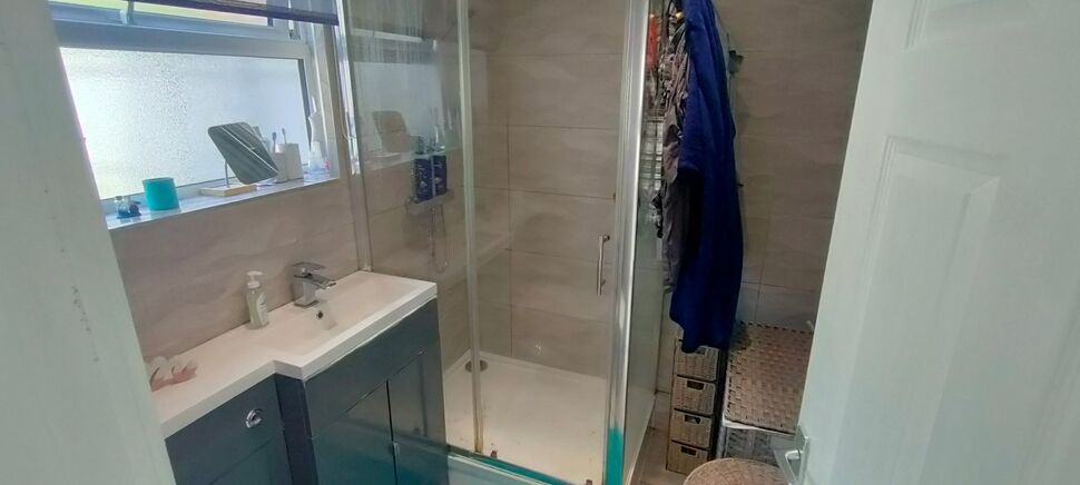 With a fitted suite of walk in shower cubicle, low level WC and vanity wash hand basin with cupboards below. Frosted UPVC double glazed window to rear. Fully tiled walls and floor. Stainless steel heated towel rail with radiator below. Ceiling downlights.