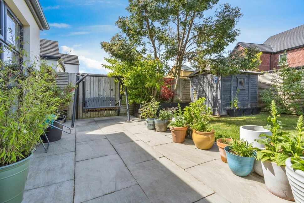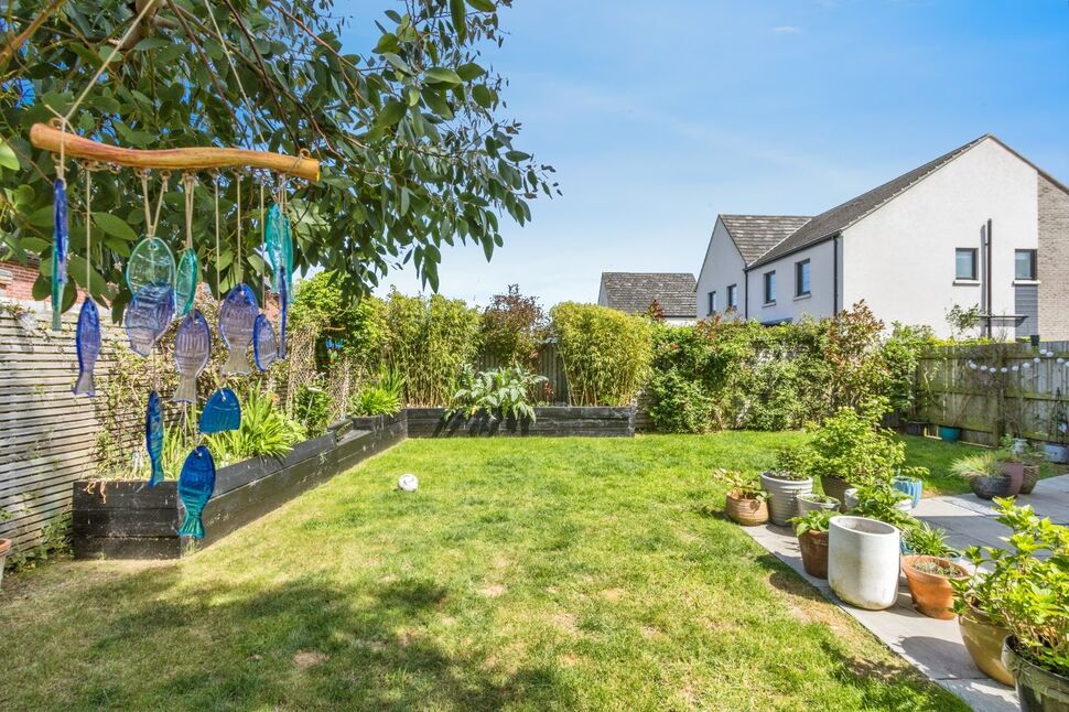 Laid in neat lawns and with a variety of mature trees and plants and shrubs with raised beds and paved patio area.
