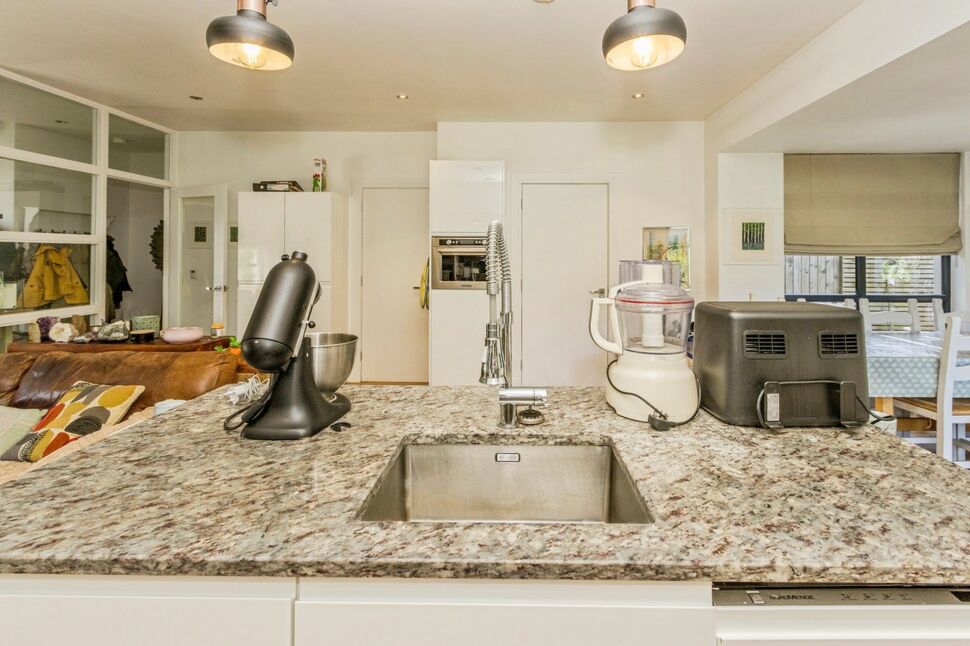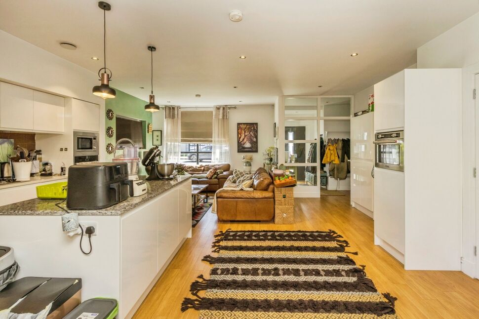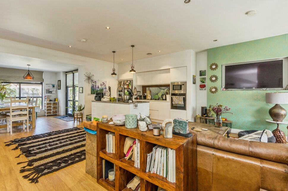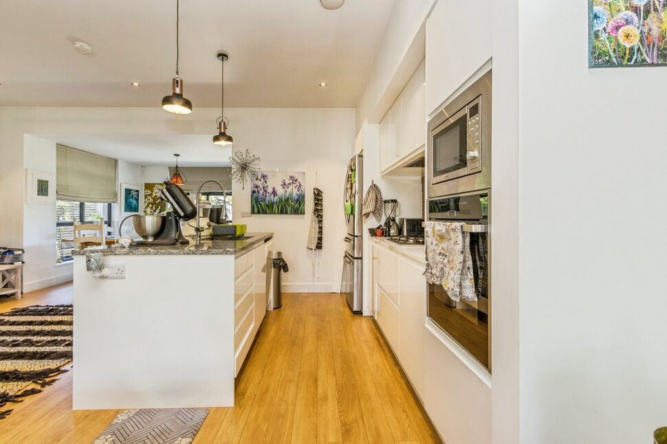 Feature island unit with Quartz top, inlaid sink unit, buily-tin electric oven and gas hob unit, integrated dishwasher, space for American fridge/ freezer, open plan to living area with wall mounted TV inset area, laminate flooring.