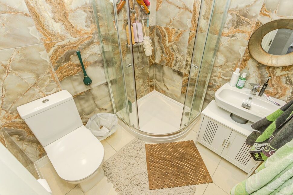 Separate shower cubicle with controlled shower, low level WC, wash handbasin, wall and floor tiling.