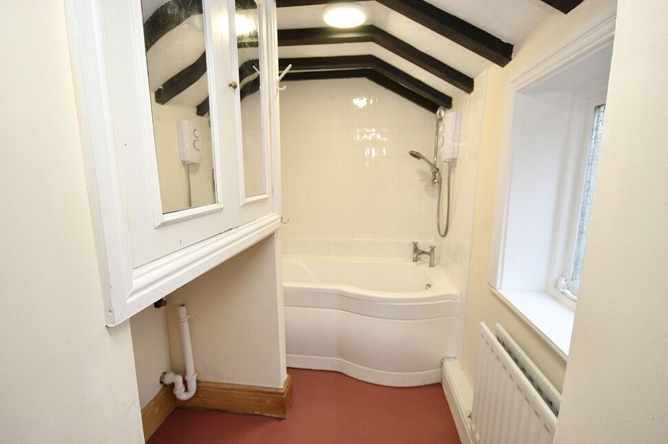 A white three piece suite featuring a panel bath with over electric shower, pedestal wash basin, low flush wc, built-in cupboard, plumbing for a washing machine, radiator, frosted double glazed window, exposed ceiling beams.
