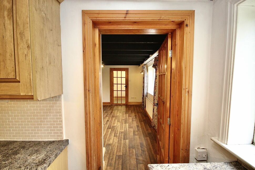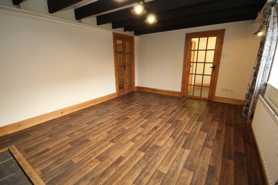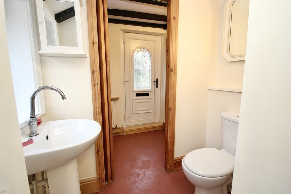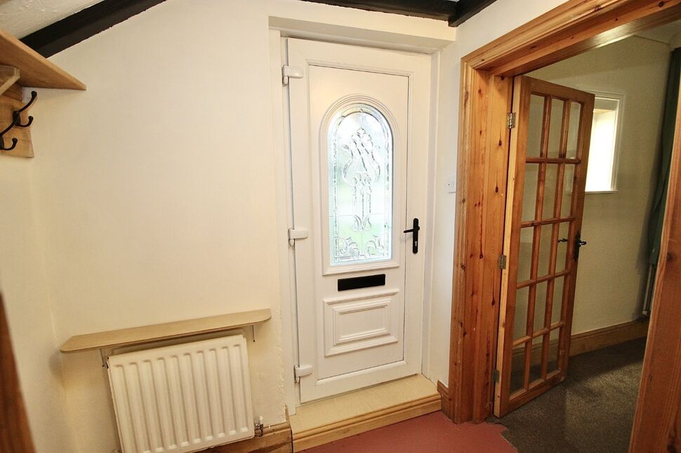 Upvc front door, exposed ceiling beams, radiator, doors opening into the living room plus downstairs bathroom.