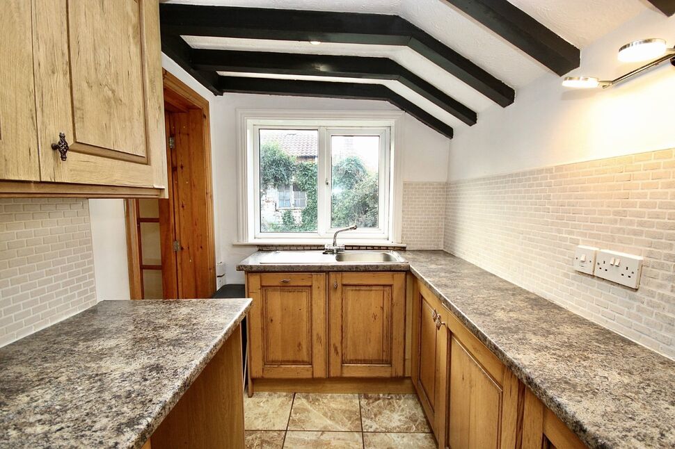 A range of wall, base and drawer units, electric oven and hob, cooker hood, tiled splash-back, space for under counter appliances, stainless steel sink, exposed ceiling beams, spotlighting, double glazed window.