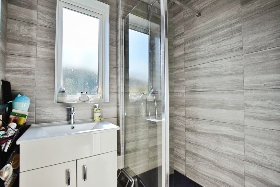 The hallway leads to a superb family shower room, featuring modern fittings, a walk-in shower with beautiful floor-to-ceiling tiling, a rectangular wash basin with a mixer tap and vanity storage underneath, and a uPVC window to the side.