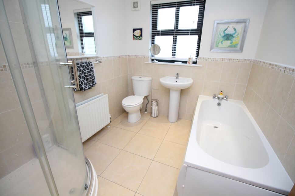 Superb four piece white suite comprising panelled bath, separate shower cubicle with wall mounted thermostatically controlled shower, pedestal wash hand basin and low flush wc. Part tiled walls and tiled floor. Spotlights.