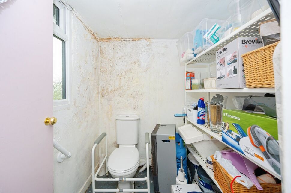 Lino flooring, central heated radiator, shower, vanity wash basin, low level w.c, two frosted UPVC windows to rear.