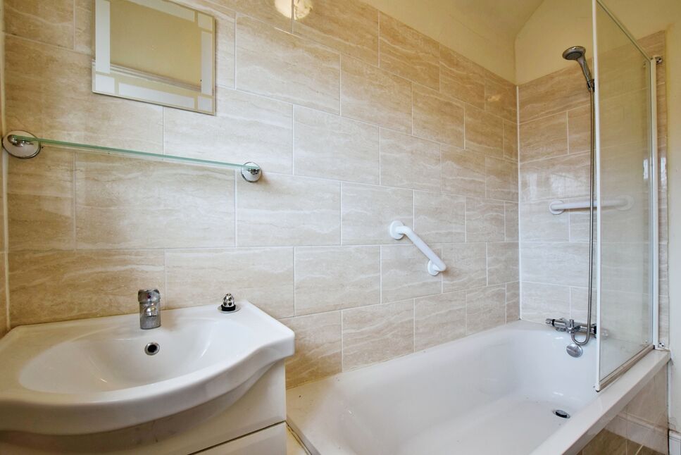 A recently improved bathroom features a panelled bath with a shower above, sink incorporating a white modern storage unit, part tiled walls, a radiator and a window to the side elevation.