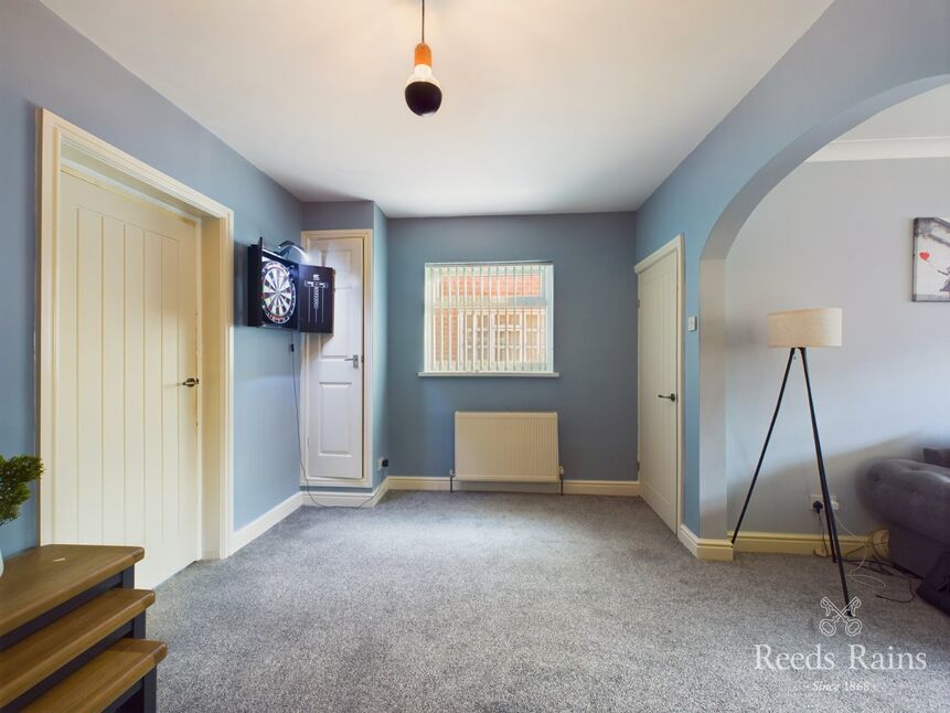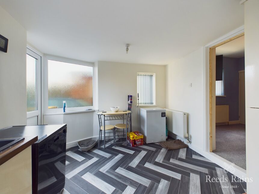 The dining room is a versatile reception area, perfect for entertaining or everyday living. Three built-in storage cupboards provide ample space, while a side-facing double-glazed window and a radiator complete the room.