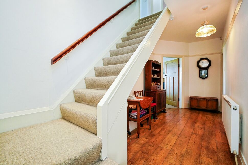 Laminate flooring, radiator, picture rail, stairs to first floor, understairs storage cupboard housing electric meter, glazed panel door leading to annexe.