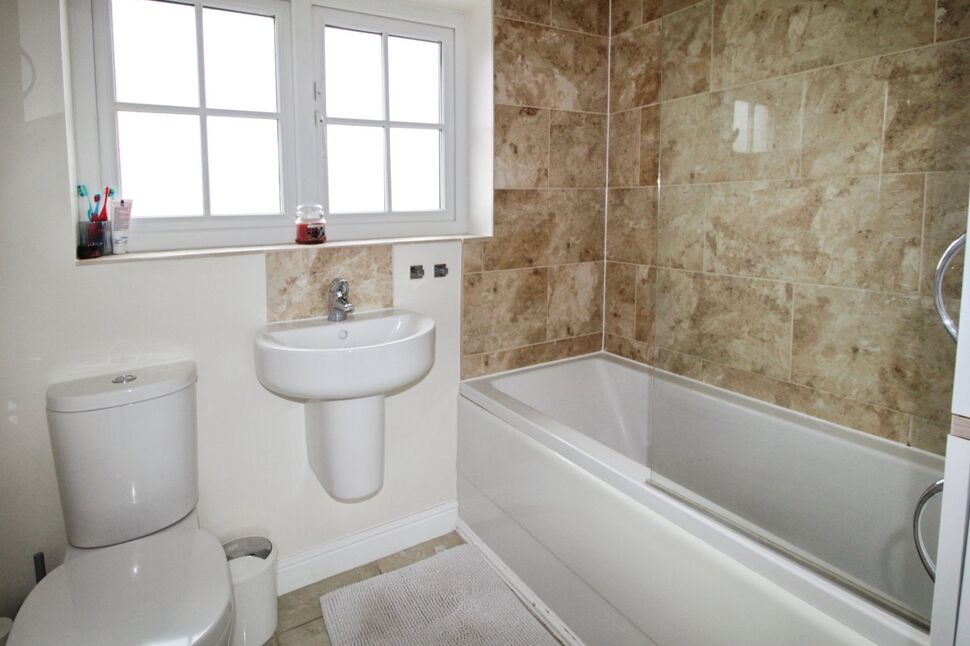 Front facing double glazed window. Three-piece suite comprising hand basin, WC and panelled bath with shower over. Tiled walls and tiled floor. Heated towel rail. Extractor fan.