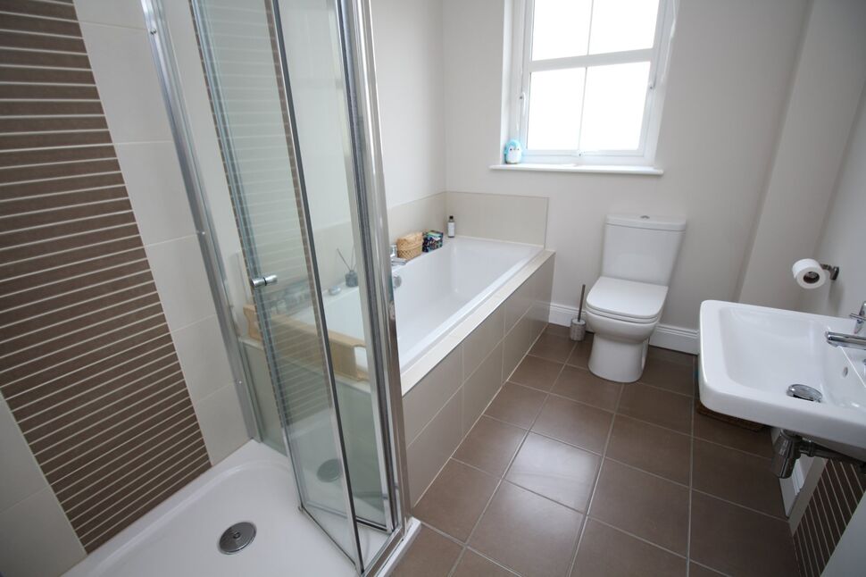Four piece white suite comprising panelled bath, separate tiled shower cubicle with wall mounted shower, wash hand basin and low flush wc. Heated towel rail. Tiled floor. Spotlights.