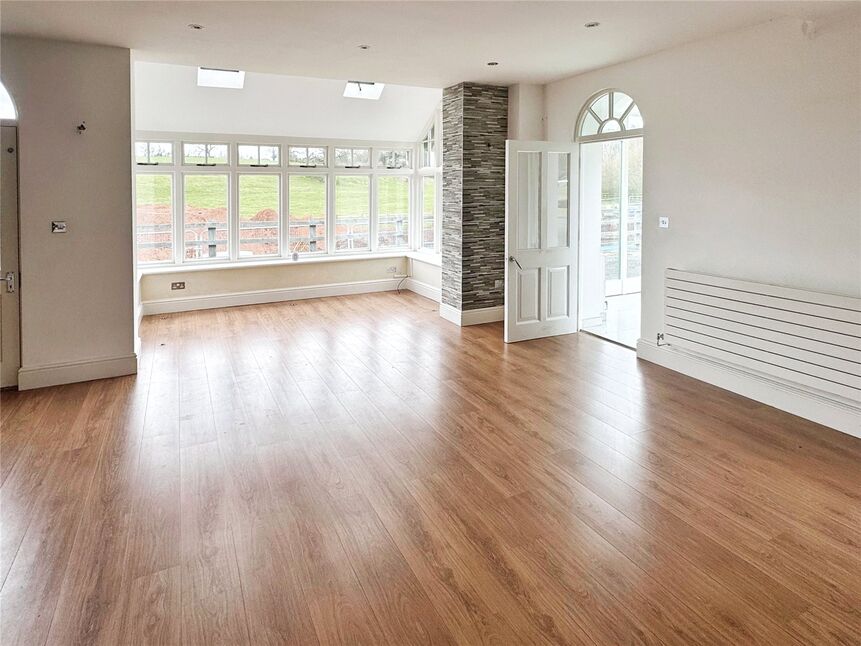 The expansive kitchen/diner is designed for the discerning home chef, featuring a U-shaped kitchen wrapping around with ample pantry cupboards, fitted hob and oven, and picturesque views of the Staffordshire countryside through dual-aspect windows and double garden doors. Additional storage solutions are thoughtfully placed next to the sunroom and beneath the staircase.