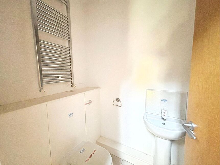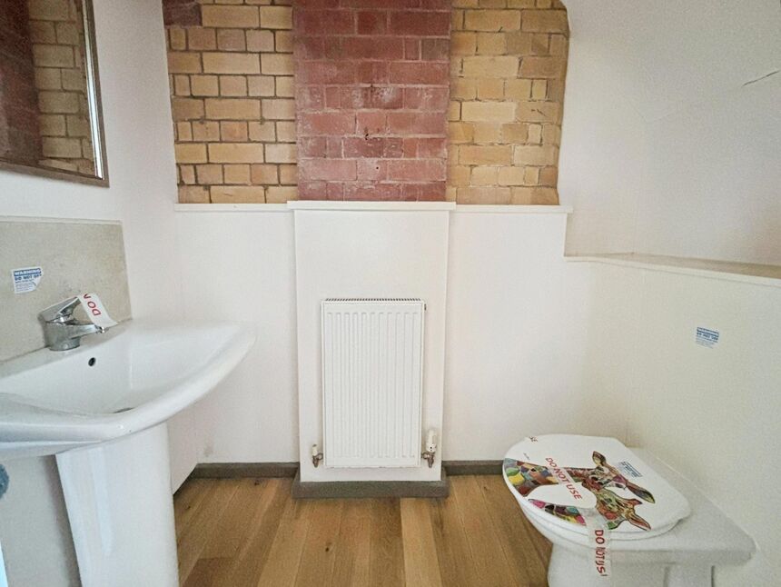 Step into this elegantly designed guest cloakroom, conveniently located just off the entrance hall. Boasting stylish tiled flooring, a practical low-level WC, and a classic pedestal sink, it combines functionality with tasteful detail. A heated towel rail adds a touch of warmth and comfort, making this space both welcoming and practical for guests.