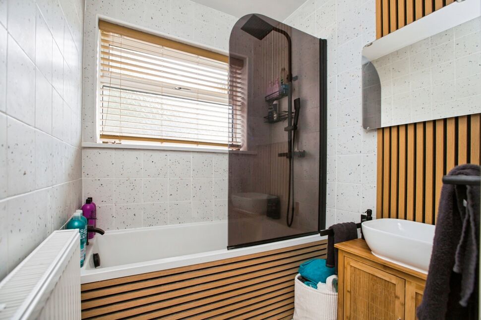A fully tiled bathroom with a panelled bath and shower over and a wash basin set to a vanity unit. Window