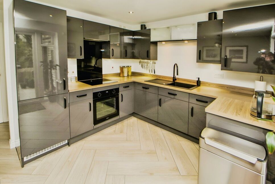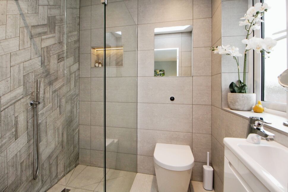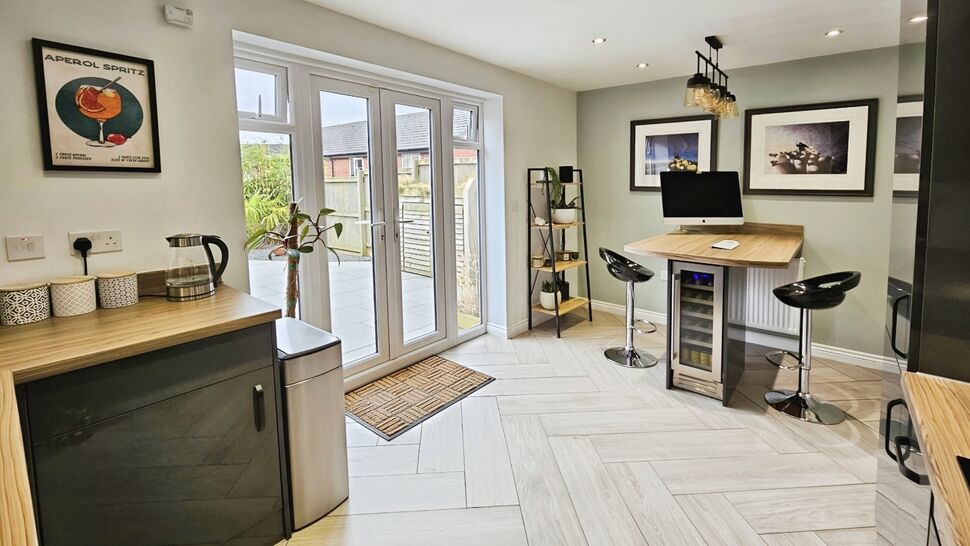 At the heart of the home is the spacious dining kitchen, complete with sleek grey gloss units, a breakfast bar, and modern lighting. French doors open out to a stunning landscaped garden, blurring the line between indoor and outdoor living. Whether you’re hosting a lively garden party, a laid-back summer barbecue, or just enjoying your morning coffee in the sun, this space was made for sharing. A stylish downstairs WC with feature tiling and motion-sensor lighting adds everyday practicality with a touch of luxury.