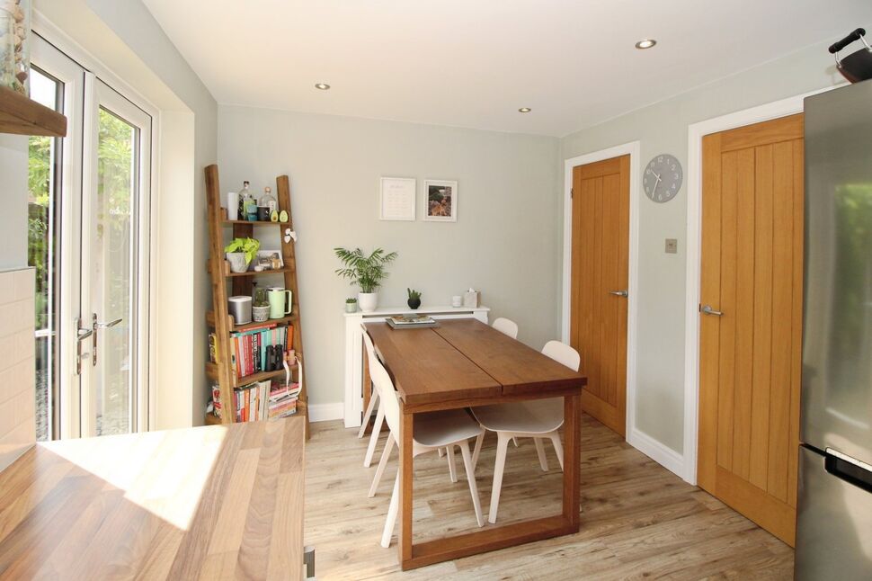 Rear facing double glazed window and double glazed French doors leading to the private rear garden. Range of wall and base units with worktop surfaces and 1 1/2 bowl sink unit with mixer tap. Integrated electric oven and four ring gas hob with extractor hood over. Integrated washing machine, space for fridge freezer. Part tiled walls. Laminate floor. Radiator. Under stairs storage cupboard.