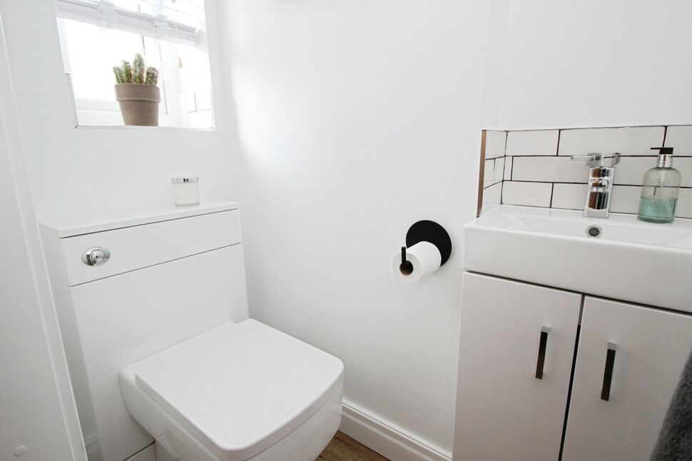 Front facing double glazed window. Modern two piece suite comprising handbasin and WC. Heated towel rail. Laminate floor.
