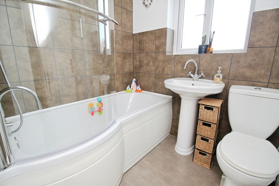 Front facing double glazed window. Three piece suite comprising handbasin, WC and P-shaped bath with mixer tap and shower extension. Part tiled walls. Heated towel rail. Extractor fan.