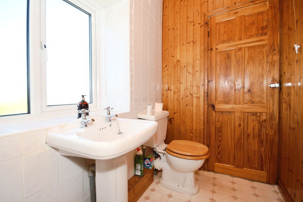 A generous space fitted with corner bath, low level WC and pedestal hand-wash basin. With vinyl flooring, partial tiling and frosted double glazed window to the side.