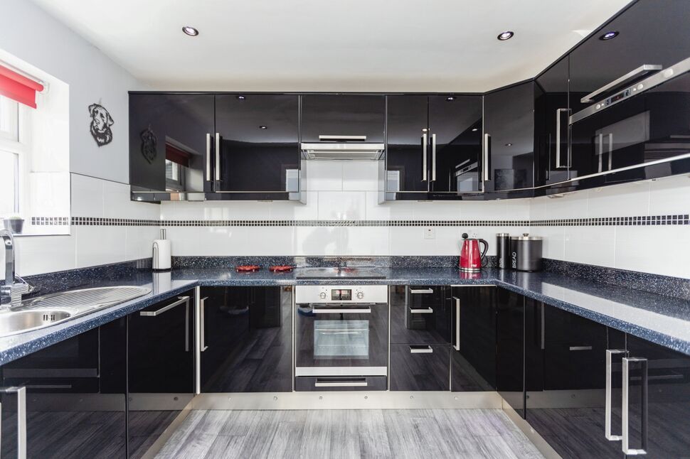 Range of modern base and wall cupboard units with work top surfaces incorporating a circular sink unit with mixer tap. Integrated washing machine, dishwasher, microwave, built in electric oven, induction hob and extractor hood. Central heating radiator and double glazed window overlooking the rear elevation.