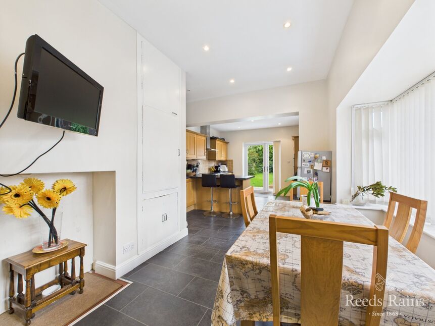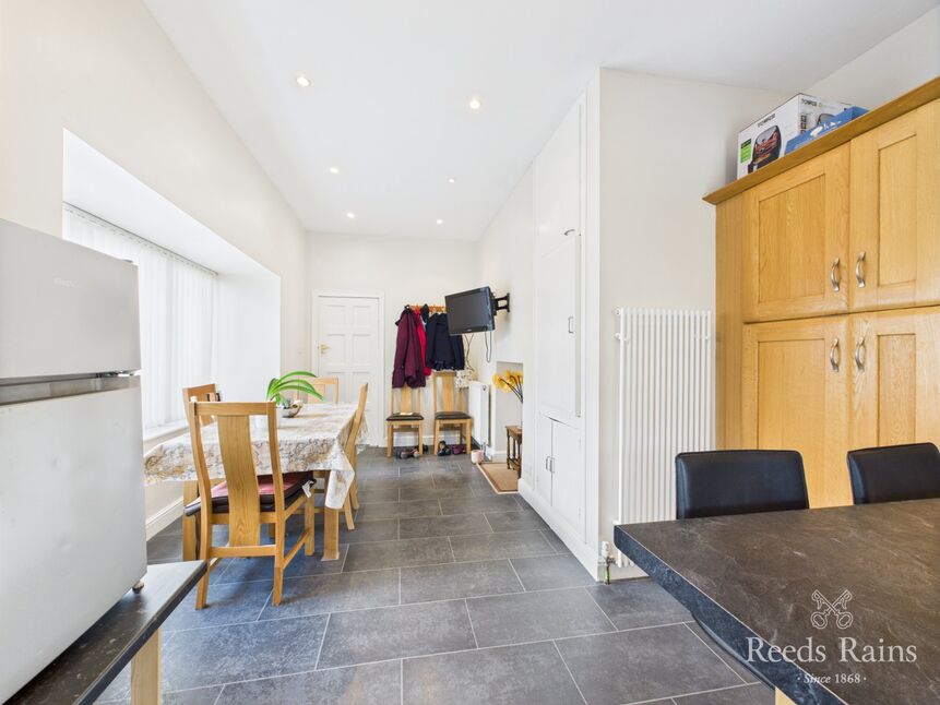 Truly the heart of the home, this expansive space is thoughtfully zoned for both cooking and dining, the space enjoys an abundance of natural light thanks to a charming walk-in bay window to the side and French doors opening onto the rear garden—perfect for blending indoor and outdoor living. The kitchen area is appointed with an extensive range of traditional oak Shaker-style cabinetry offering ample storage through a combination of cupboards and drawers, all topped with complementary laminated work surfaces and stylish ceramic-tiled splashbacks. A composite sink unit is perfectly positioned beneath the window, while a suite of integrated appliances enhances both convenience and style—including an electric hob with extractor hood, built-in oven, fridge/freezer, dishwasher, and washing machine. Ceiling spotlights and a hard-wearing laminate floor complete the polished look. Adjacent to the kitchen is a generous breakfast and dining area, ideal for family meals or casual entertaining. This space easily accommodates a dining table and chairs, with additional built-in cupboards for added functionality. It’s a bright, sociable space that brings everyday practicality together with refined family living.