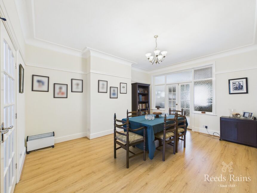 A fabulous formal dining space, ideal for entertaining and family meals alike. This well-proportioned room offers ample space for a large dining table and accompanying furniture, making it a natural hub for celebration and conversation. The neutral décor is highlighted by ceiling coving and a picture rail, while the warm laminate flooring and central heating radiator ensure a comfortable atmosphere year-round. Double doors at the far end lead through to the adjoining study, creating a seamless flow between spaces and offering flexibility for modern living.