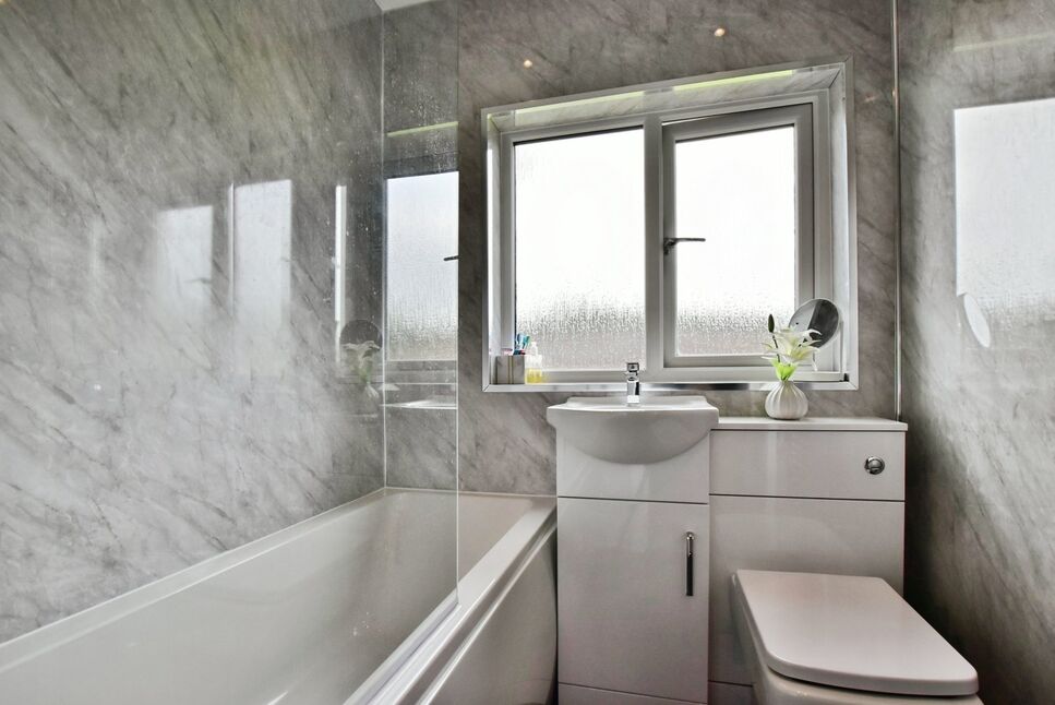 Fitted with a modern suite, comprising- Bath with a mixer bar shower over and screen. WC, was hand basin, towel radiator. Tiled walls.