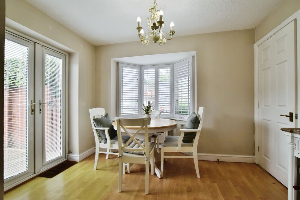 Ample space for a table and chairs, laminate flooring, radiator, an arch to the kitchen, and French doors opening onto the patio/ garden.