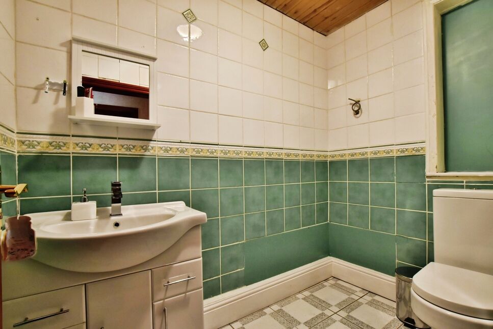 Conveniently located next to the bedrooms, fully tiled with a timber ceiling and vanity wash basin — a practical addition for busy family mornings.