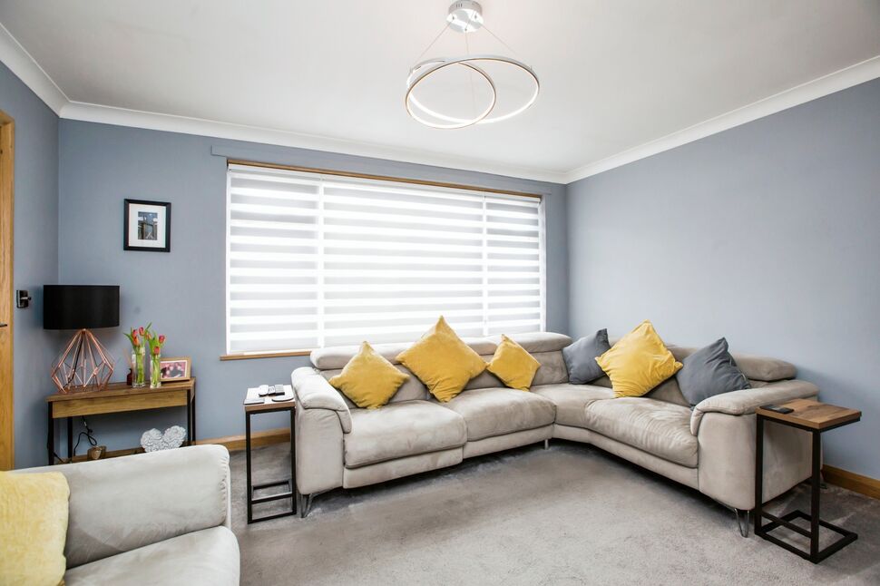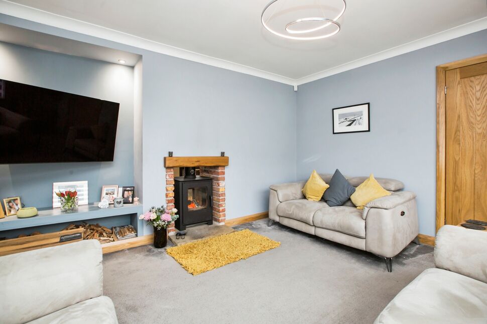 A generously sized living room located at the front of the house, featuring a multi fuel burner. The room offers plenty of natural light and a welcoming atmosphere.