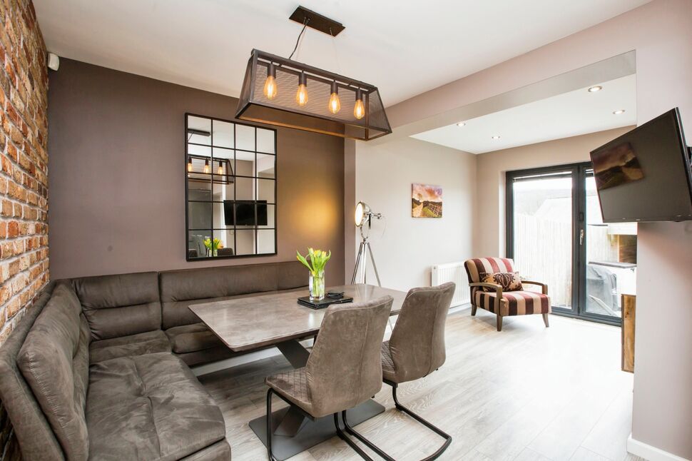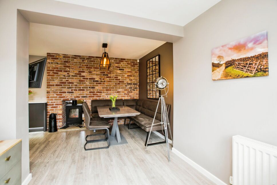 A lovely modern dining area. A feature of the room is the log burner set into the wall, offering a contemporary feature that can be admired from both the living room and dining/kitchen.