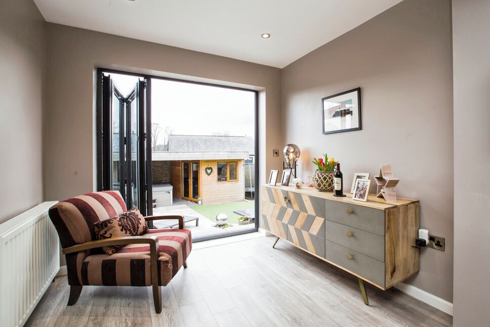 A stylish, modern open-plan kitchen and dining room, designed with contemporary finishes and a spacious layout. The kitchen is equipped with integrated high-end appliances including two fridges, freezer, wine cooler, microwave, and plenty of counter space. Bi fold doors at the back open up to the garden