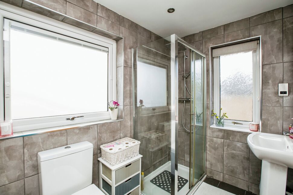 A spacious bathroom situated at the rear of the property, featuring a frosted glass window for privacy. The bathroom includes a toilet, sink, bathtub, and a separate shower cubicle. This room also has underfloor heating.