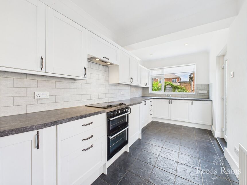 The kitchen is stylishly appointed with a comprehensive range of contemporary Shaker-style base and wall units, offering both functionality and timeless appeal. Complementary work surfaces and a tasteful tiled splashback enhance the overall aesthetic. There's ample space for a range of appliances, making it a practical hub for daily cooking and meal prep. A side door provides convenient access to the outside, perfect for bringing in groceries or stepping out into the garden.