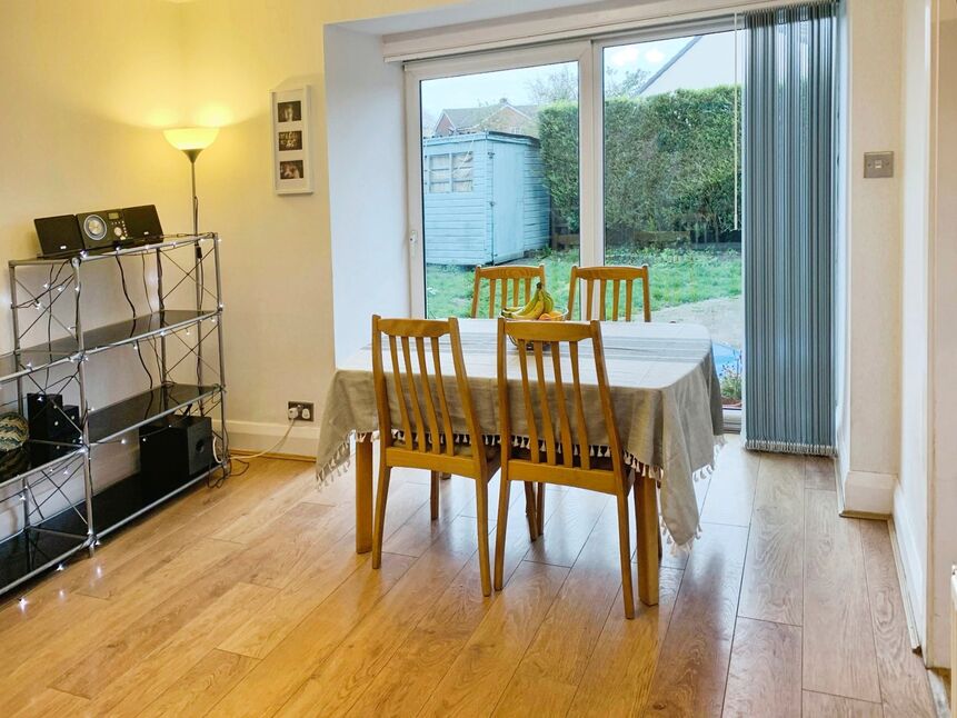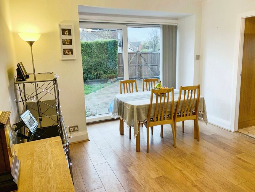 Sliding UPVC double glazed patio doors overlook the rear garden and doorways lead to the living room and kitchen. With stylish laminate flooring and central heating radiator.