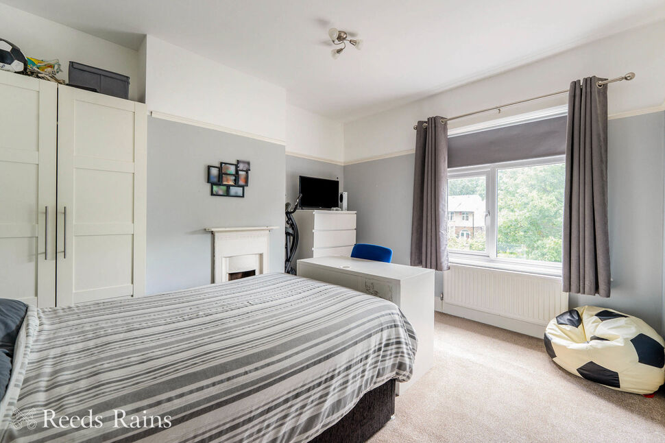 Fourth double bedroom with rear facing double glazed window. Radiator. Decorative cast iron fireplace. Built-in wardrobe.