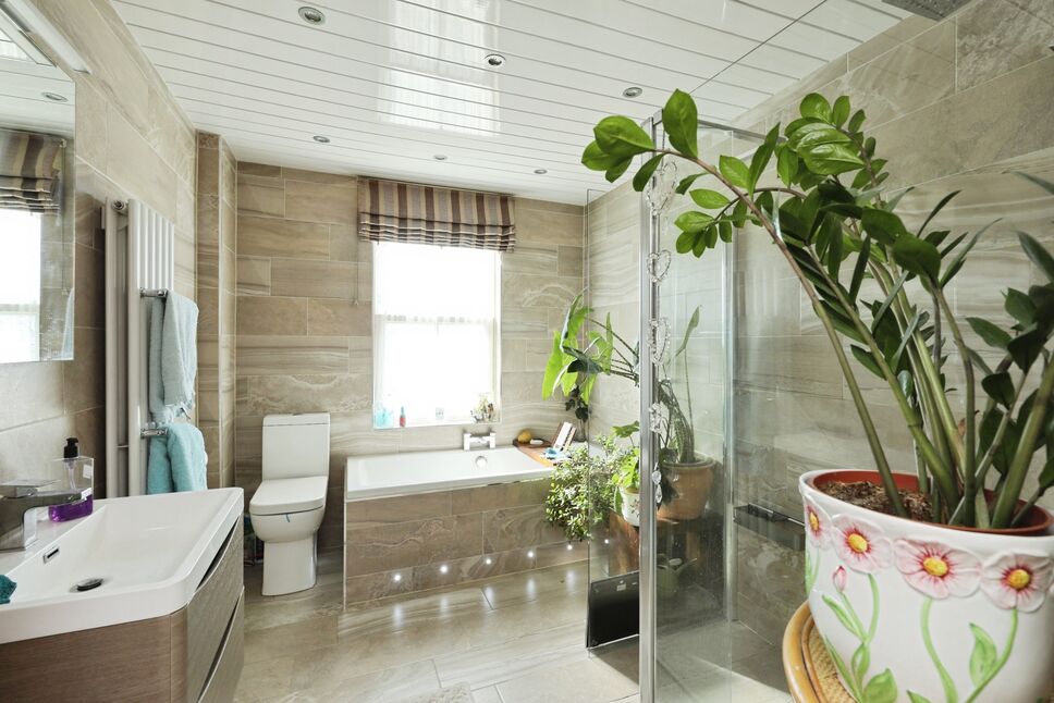 Stunning family bathroom briefly comprising; tiled bath with spotlights, walk in double shower with waterfall shower and showerhead, wall mounted hand wash basin with vanity unit below, W.C, tiled walls with built in shelving, spotlights to the ceiling, extractor fan, fully tiled walls, tiled flooring, modern vertical central heating radiator, and side facing double glazed obscure sash window.