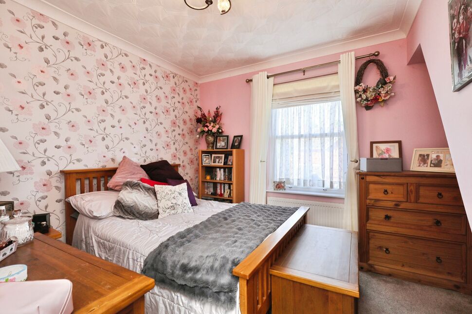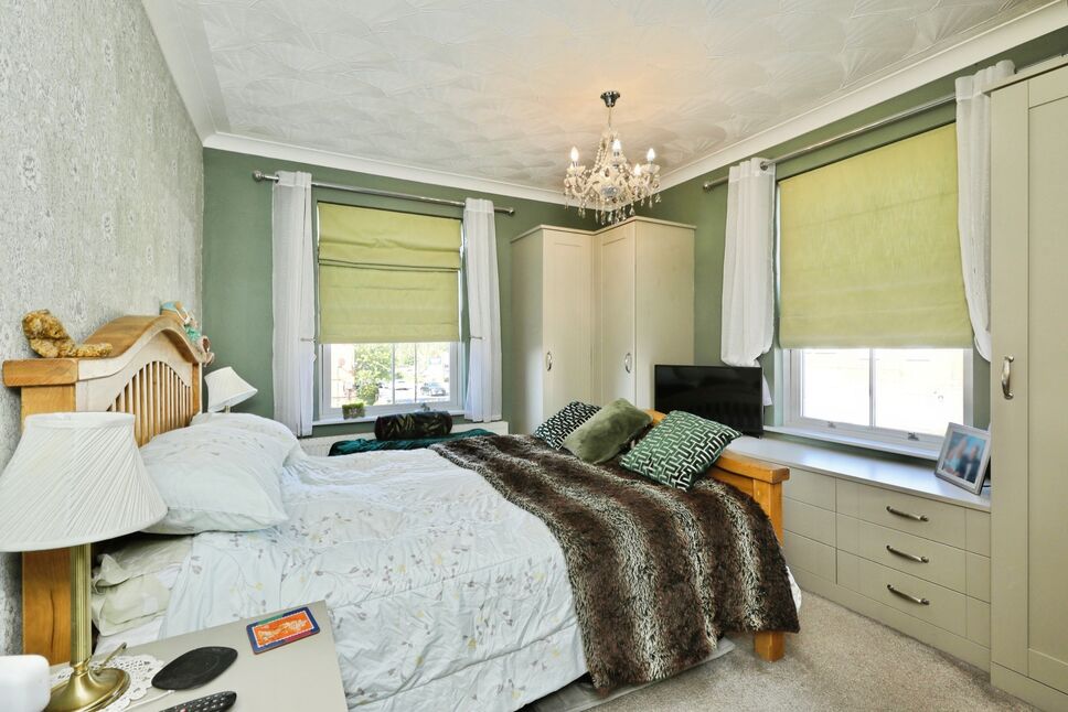 Generous sized bedroom with fitted carpet, central heating radiator, fitted wardrobes, front and side facing double glazed sash windows.