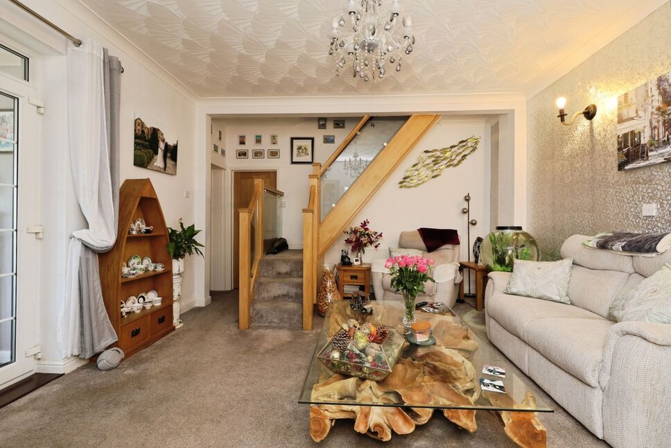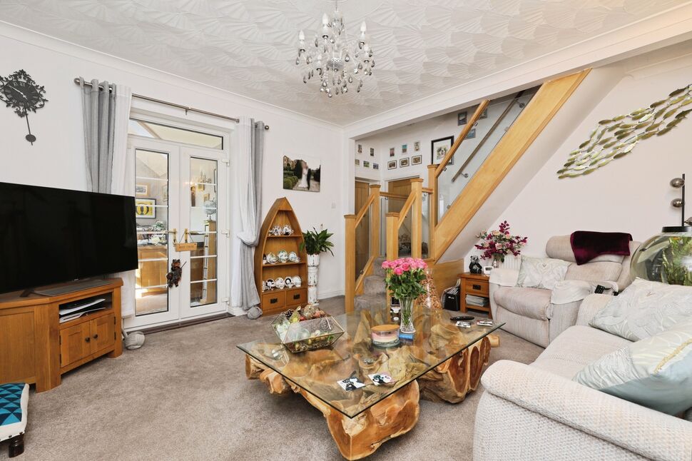 Spacious living room with fitted carpet, feature wall lights, two central heating radiators, staircase with beautiful glass banister rising to the first floor and double glazed French doors into the orangery.