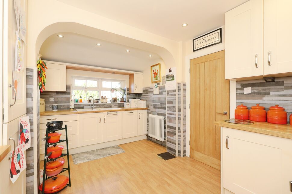 Briefly comprising; base units, sink and drainer with mixer tap, complimentary splash back tiling, extractor fan, space for a washing machine, vinyl floor covering and central heating radiator.