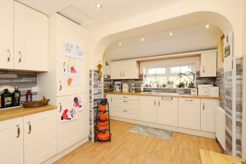Modern kitchen briefly comprising; a range of matching eye level and base units, sink and a half with drainer and mixer tap, Belling farmhouse electric cooker with gas hob and Belling cooker hood over, integrated fridge freezer and dishwasher, spotlights to the ceiling, modern column central heating radiator, vinyl floor covering and front facing double glazed window.